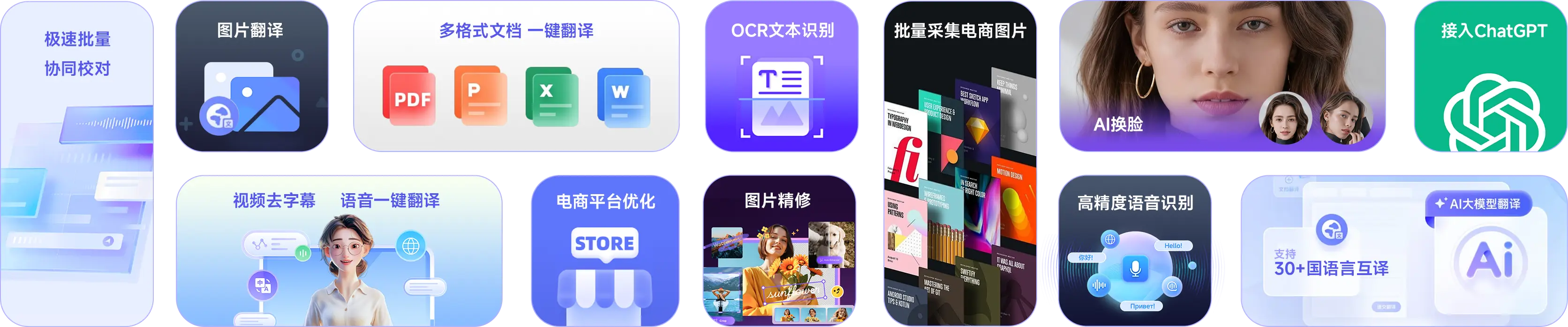 视频、图片、文档一站式翻译解决方案 批量翻译30+国语种商品图 强大的Ai运算能力 AI视频换脸与去字幕
